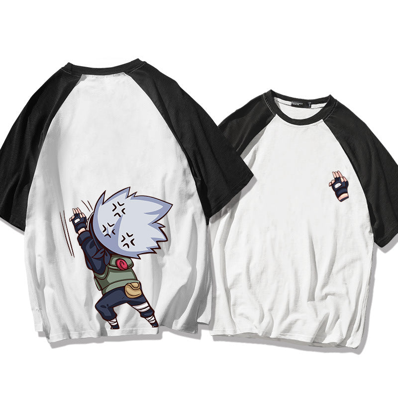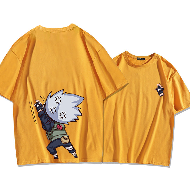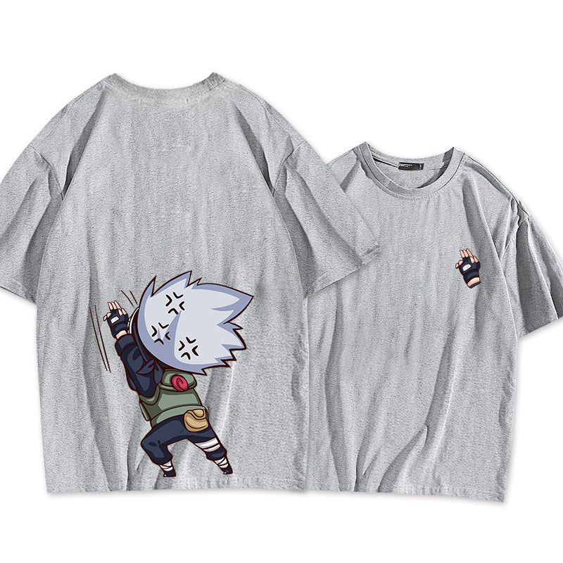 Chibi designs of Hatake Kakashi from Naruto to show his technique of One Thousand Years of Death at back. This gesture symbol printed at the front left chest as well.