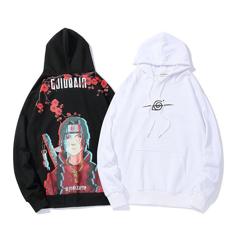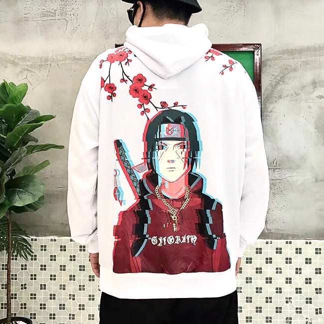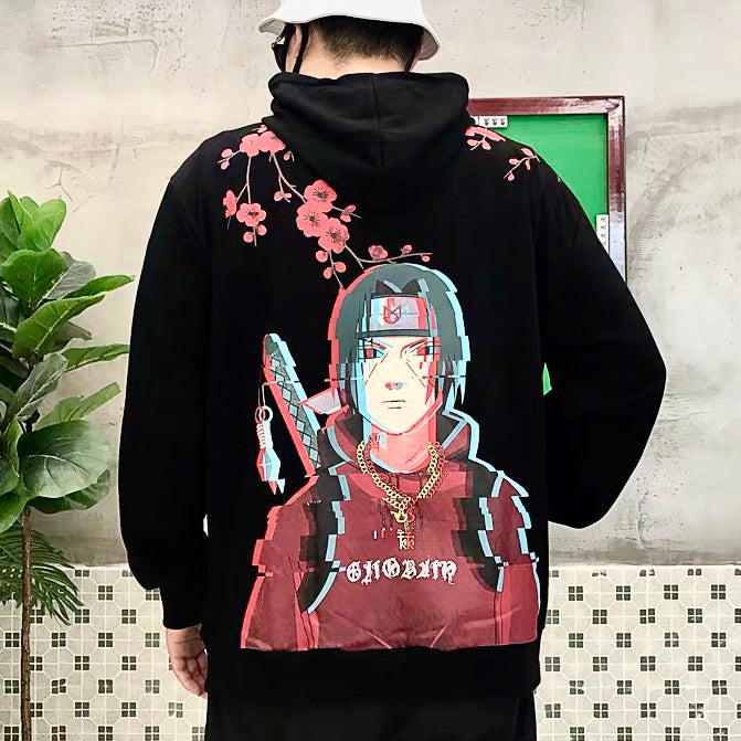 Back design with distorted pixel printing of Itachi Uchiha and hidden leaf symbol printed in the front center.