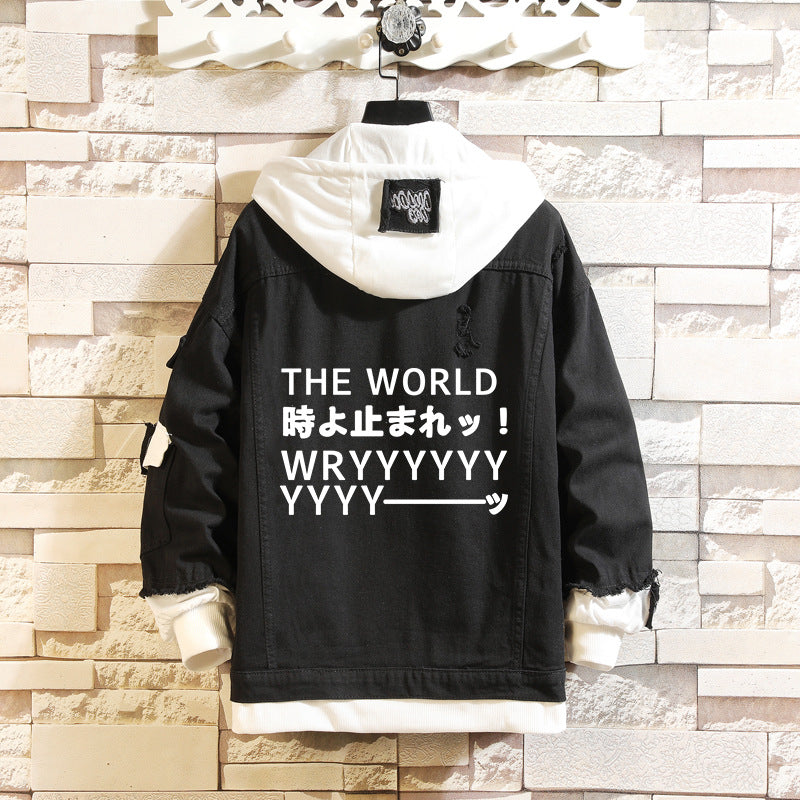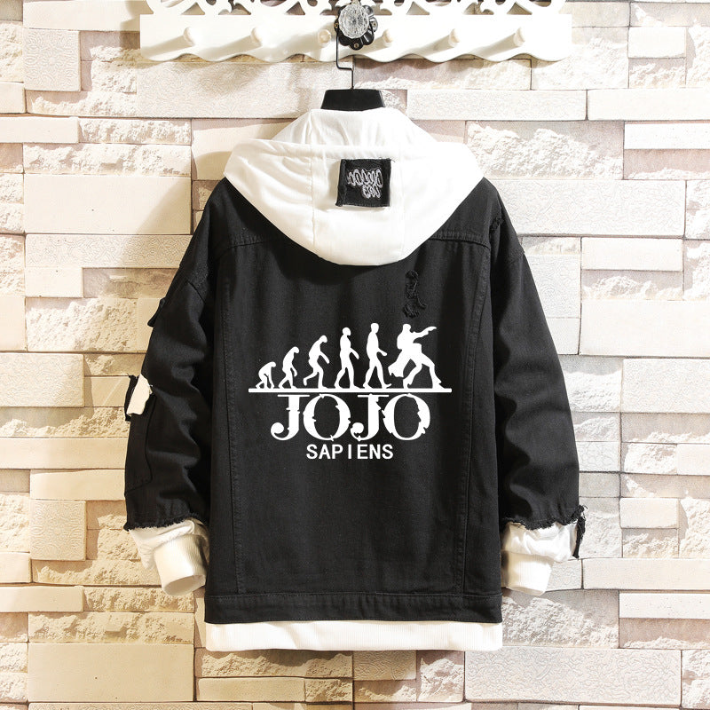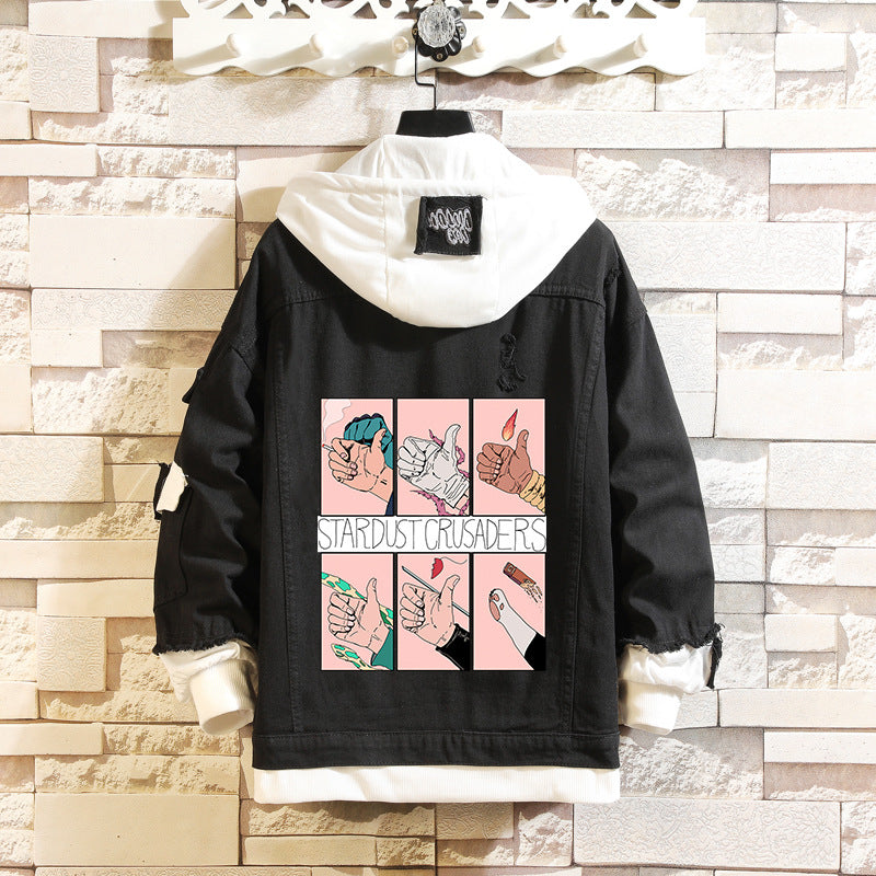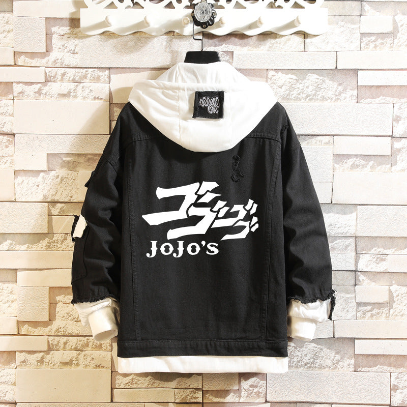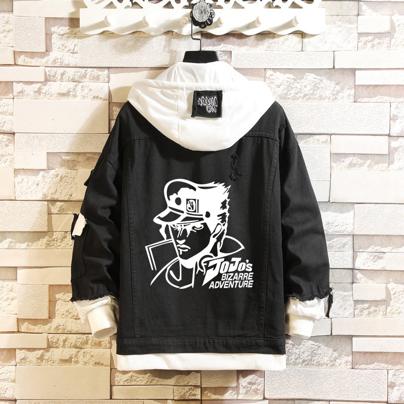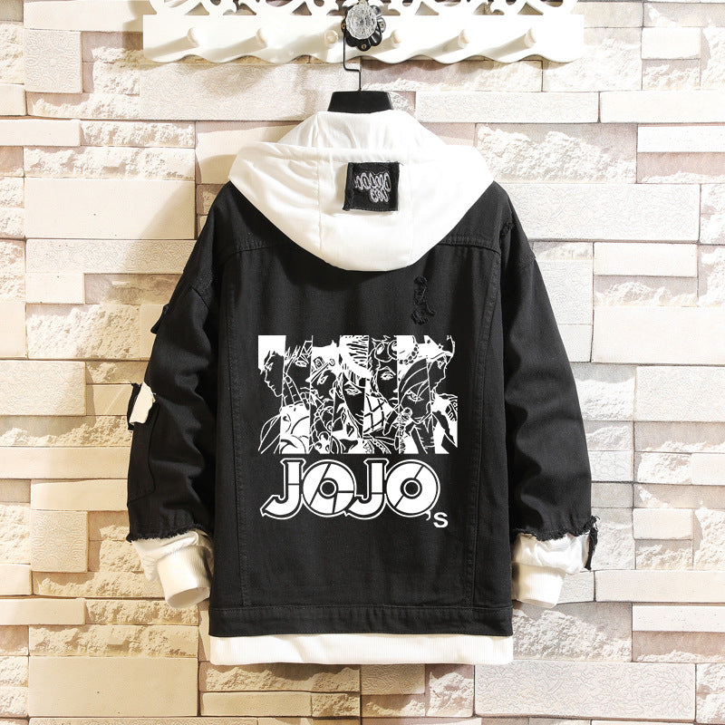 Selected denim fabric with back prints of Jojo from the Japanese manga series. Stylish design combined both hoodie and jacket, it will definitely make you the most stunning star in the street.