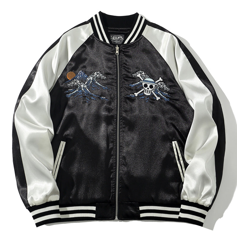 Featuring Luffy, Zoro and Sanji from One Piece in Kimono embroidered full at back. Straw Hat Pirates logo and Wando Country embroidered respectively on left and right chest.